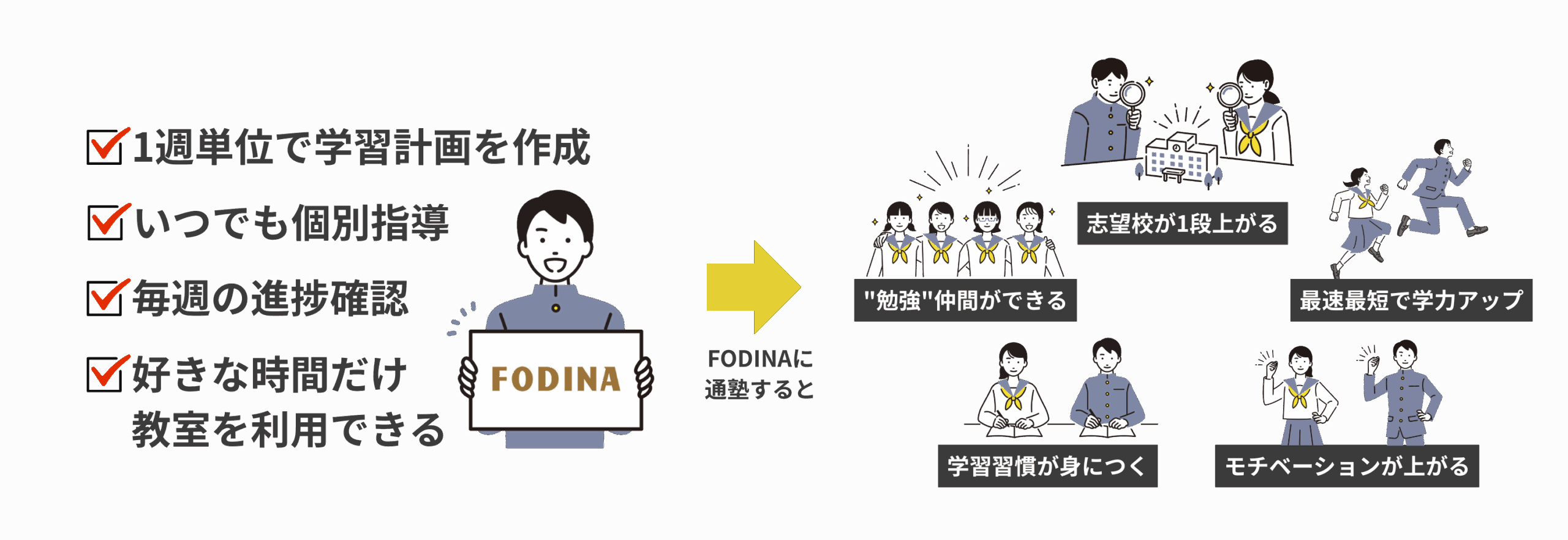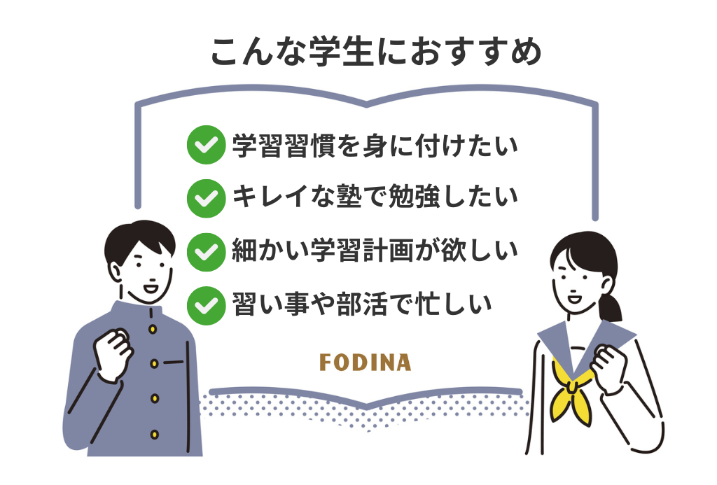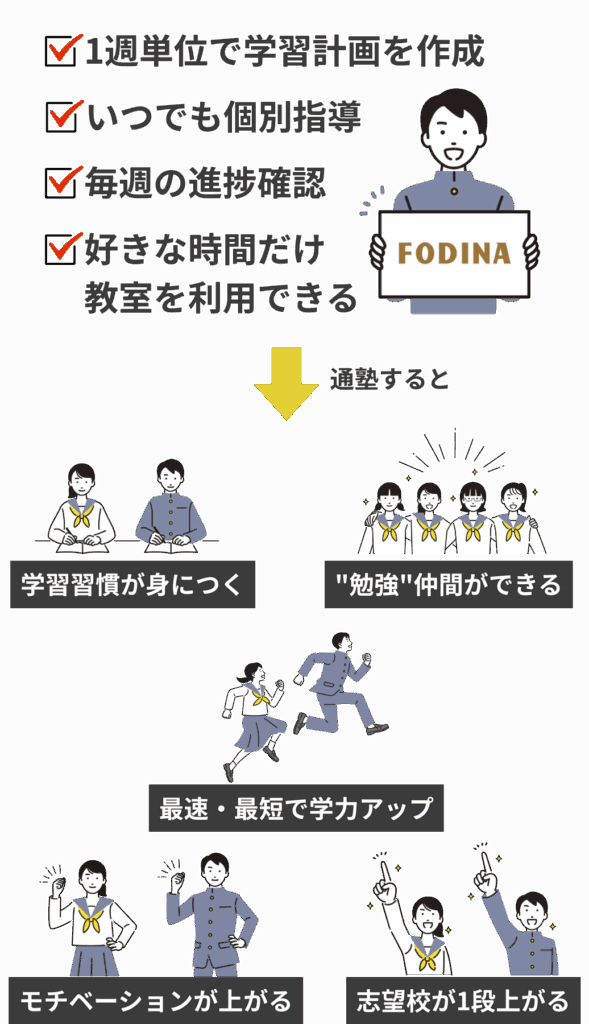 未来を切り開く新しい学習塾365日通える個別指導の学習塾です。学習習慣を身につけ、学力向上を目指します。資料請求・お問い合わせ 個別指導 FODINAとは FODINA(フォディーナ)は、365日いつでも教室に通えて、個別指導が受け放題の学習塾です。 FODINAが選ばれる理由 01個別指導塾と自習室のイイとこ取りこれまでにない体験を FODINAは個別指導塾のいい所はそのままに、自習室よりも勉強ができるためのシステムが整っています。学力向上のカギは「理解して演習の繰り返し」です。#365日通える #個別指導受け放題 #自習室が使い放題 #学力は学習量 02マンツーマンの学習管理により最適な計画で最適な学習を実施 担当講師と目標設定を行い、生徒一人ひとりのレベルに合わせた学習計画を作成します。1日単位で教材のページまで指定をして勉強内容を明確にします。また、学習状況のレポートシステムを導入して現状の把握ができます。 03リアルタイム学習指導で学習の手が止まりません わからないことがあれば、いつでも質問ができ個別指導を受けることができます。講師は教室を周回しているので、適切なタイミングで声をかけも行います。また、システムにより学習の取り組み状況も一目でチェックしています。 04日本一勉強できる毎日通える教室が利用OK 生徒が毎日通って勉強できるように365日開校し、長い時間の勉強ができるよう学習環境にもこだわっています。高校3年間の通塾して、通算5,000時間以上を塾だけで勉強した生徒もいます。 05教材は自由に選択できAI学習ツールが使い放題 目的に合わせて教材を自由に選ぶことができ、FODINAが提供するAI学習ツールで演習することもできます。生徒一人ひとりのレベルに合わせた演習問題の自動作成から、正誤結果に応じて、効率的に苦手を克服できます。 FODINAで実現できること 「わからない」が解消できる 学校の授業でわからなかった部分や、自分で解決できない疑問を、質問しやすい環境ですぐに解消できます。特に個別指導では、生徒の理解度に合わせて指導を受けられるため、苦手科目の克服や基礎知識の定着を効率よく図れます。 詳しく見る 学習内容・計画の効率化 長年の経験と実績に基づいた効率的な学習カリキュラムが用意されています。これにより、独学では難しい「何を、いつまでに、どこまでやるか」という学習の道筋が明確になり、無駄なく学習を進められます。 詳しく見る 定期テストの成績アップ 全国の教科書に準拠・対応した教材から、学校ごとの出題傾向を分析した定期テスト対策を受けられるため、効率的に点数アップを狙えます。これは、高校受験や大学の推薦入試などで重要になる内申点の評価を高める上でも大きなメリットです。 詳しく見る 集中できる学習環境の確保 自宅には誘惑(ゲーム、スマートフォンなど)が多いですが、塾の自習室は「勉強する場所」として集中できる環境が整っています。授業がない日でも利用できることが多く、学習時間を確保しやすくなります。 詳しく見る 学習習慣の定着 塾に通うことで、放課後の一定時間を強制的に勉強に充てることになり、規則正しい学習習慣が身につきやすくなります。また、塾の宿題をこなすために、家庭学習の習慣も自然と身につきます。 詳しく見る 高いモチベーションの維持 同じ目標を持つ仲間や、熱心な講師の存在は大きな刺激となります。切磋琢磨し合うことで、一人では保ちにくい学習意欲(モチベーション)を維持しやすくなります。 詳しく見る 合格するための受験対策 入試制度や各学校の出題傾向、最新の受験情報を常に収集・分析しています。合格から逆算した受験対策講師は、目標達成に向けて合格から逆算した計画立案を年・月・日に落とし込み、指導を行います。 詳しく見る 安心・安全サポート FODINAでは、お子さまが安心して通える環境を最優先に考えて、IT化を行いセキュリティの対策を徹底しています。監視カメラの設置、オートロック施錠、通塾・退塾時の通知 ほか私たちは、お子さまの「安全」を最優先に考えています。 詳しく見る サービス充実した学習サポート FODINAでは、小学生から高校生までの学習・成長を全面的に支援します。ご要望が多かった学童型学習塾も始めました。コース一覧をみる 高校生の方 中学生の方 小学生の方 学童 コース一覧はこちら 学習塾の”あたり前”を変える 個別指導が受け放題無制限で質の高い個別指導を提供します。 365日利用可能定休日が無く、毎日定額利用できます。 週1生徒面談講師が学習計画を都度確認・修正します。 お知らせ 【戸塚の中学生必見】FODINAの無料特別講義で進路と学習習慣を強化しよう 2025年10月1日 記事を読む 夏休みの教室利用状況 2025年8月度 2025年9月5日 記事を読む 良質な学習を習慣化させるコツ3選 2025年8月15日 記事を読む LINE公式アカウント開設のお知らせ 2025年7月1日 記事を読む 英単語を最速で覚える方法 2025年6月24日 記事を読む 夏期講習2025のお知らせ 2025年6月15日 